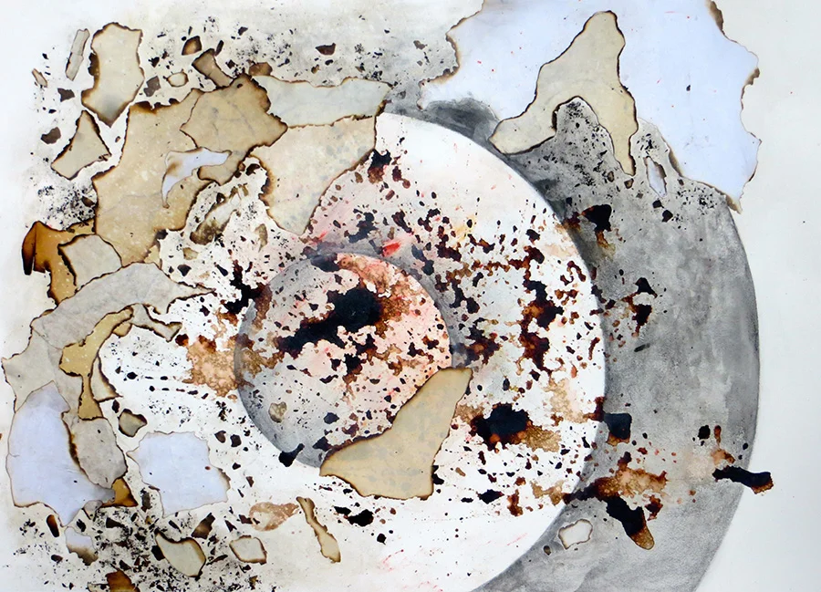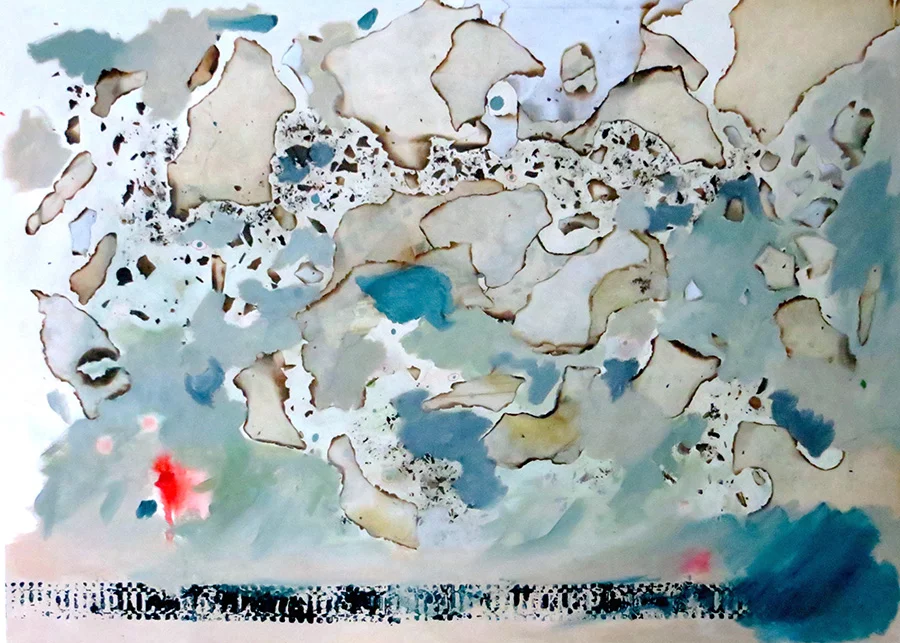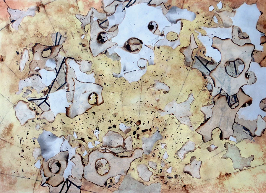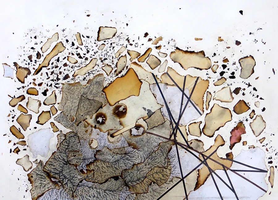 collage, coffee, graphite and oil on paper