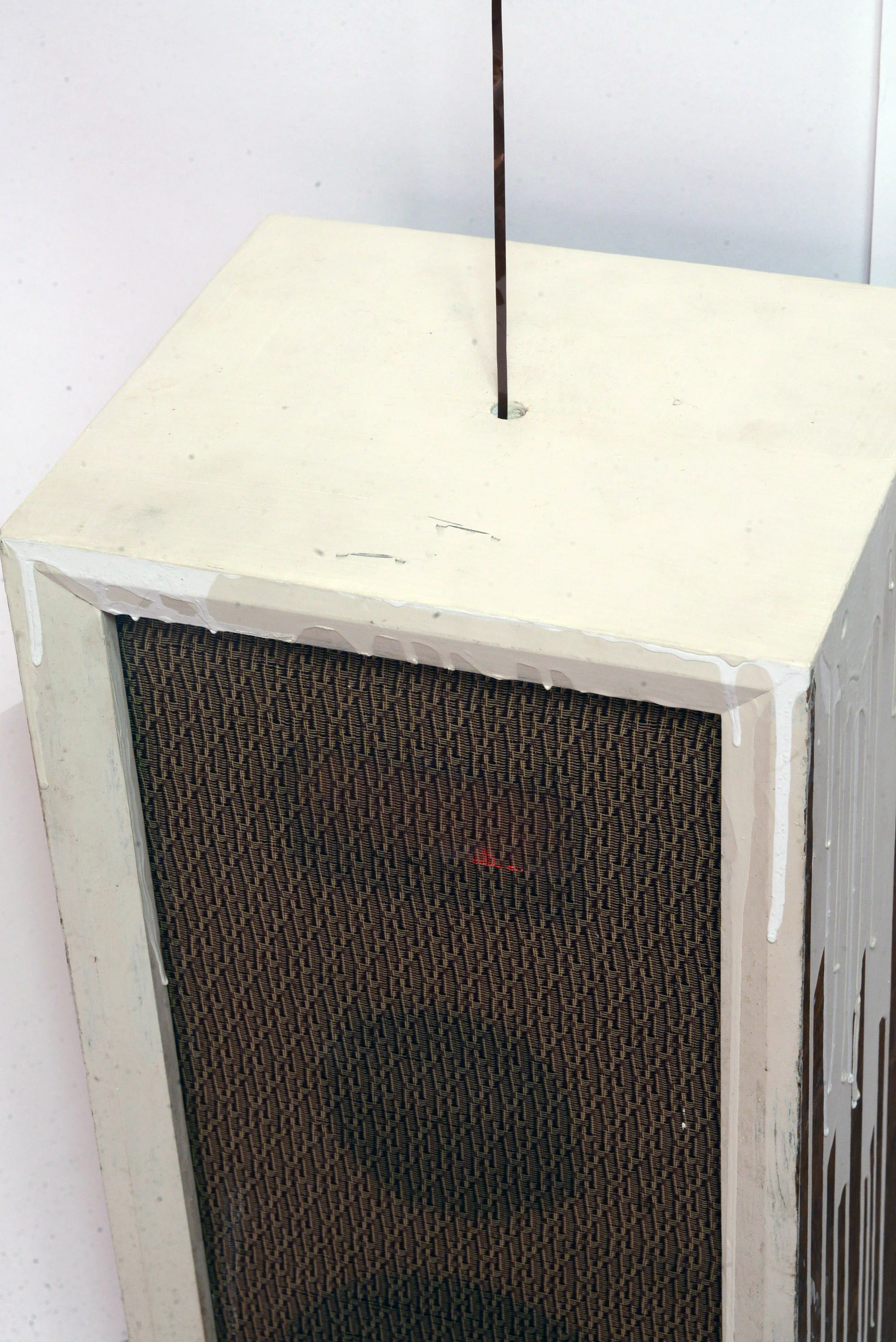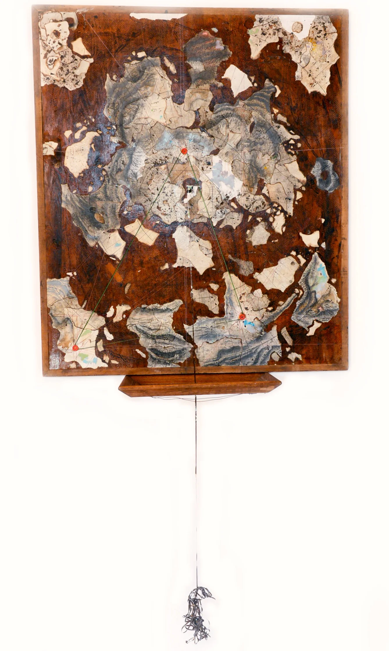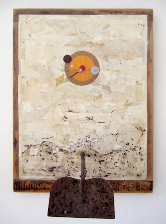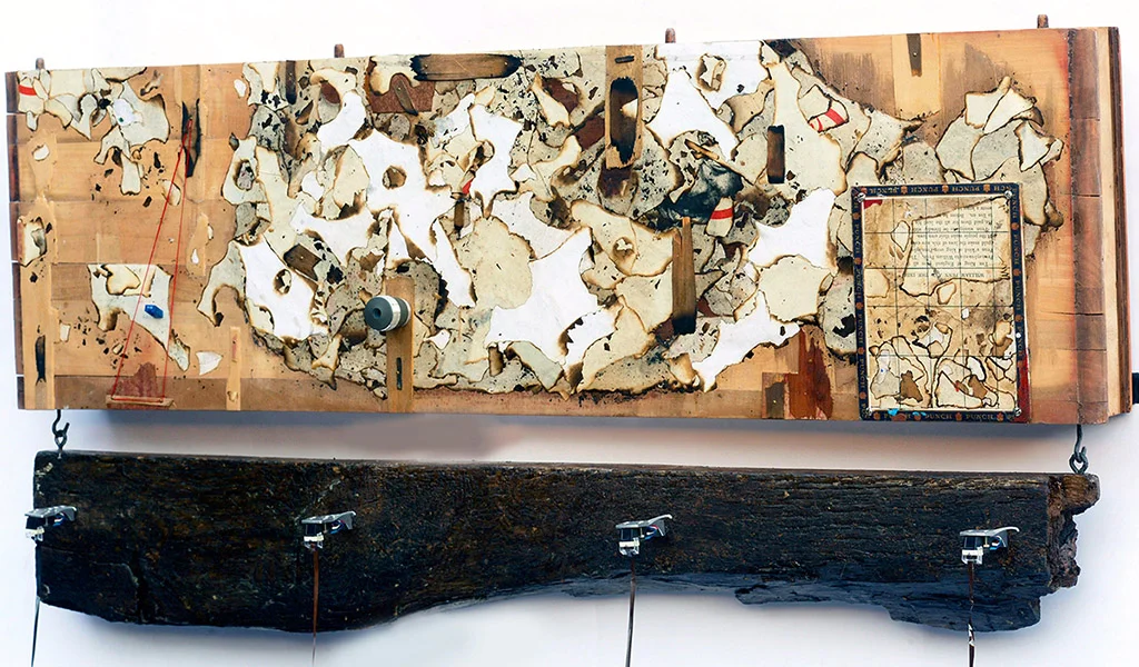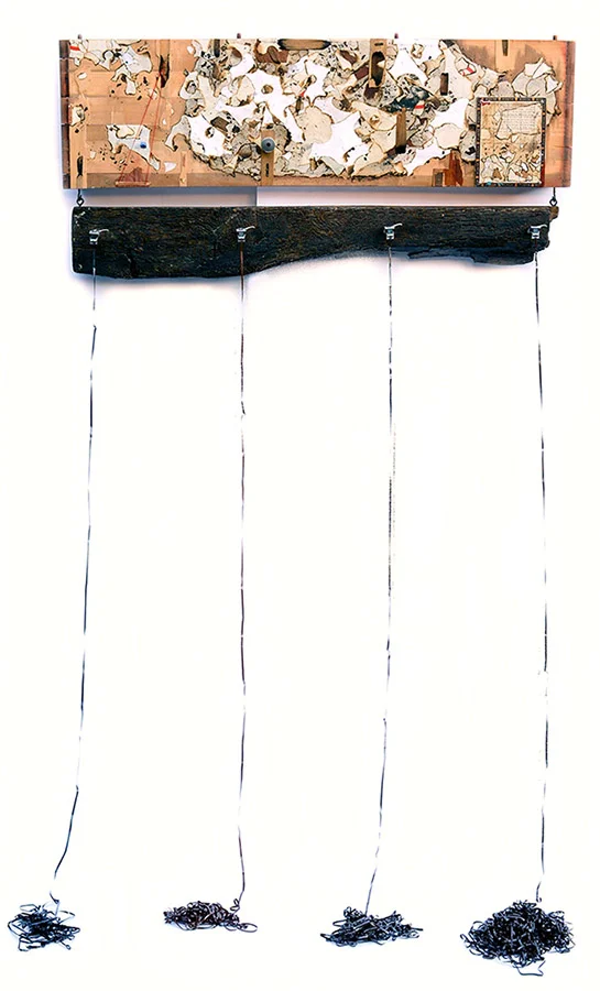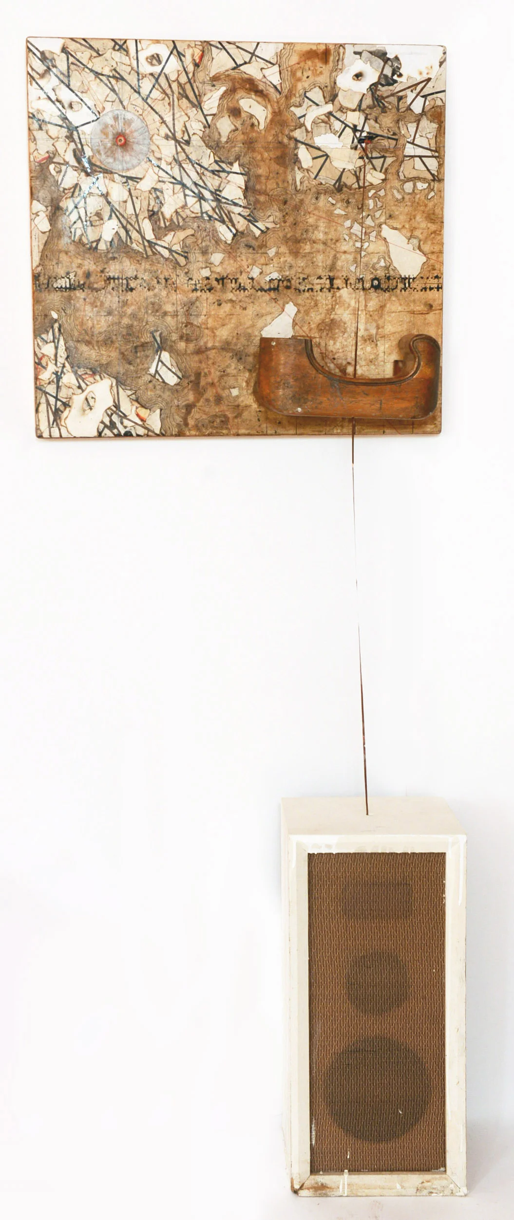cassette tape, coffee, collage, conté, found objects, graphite, ink and wax on paper, mounted on wood