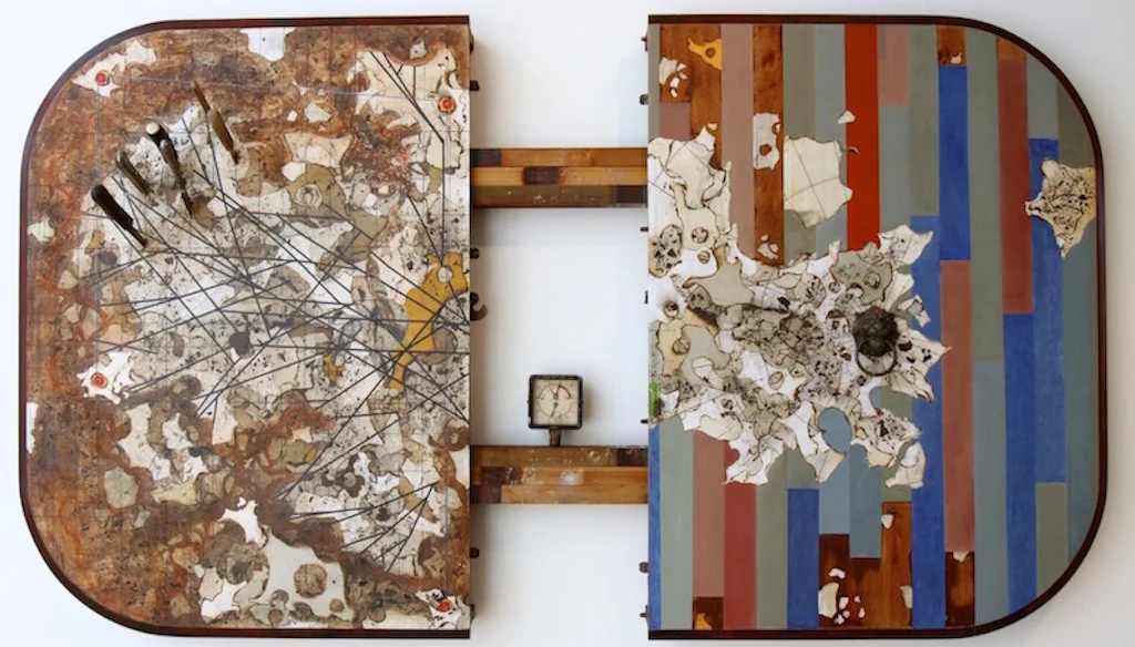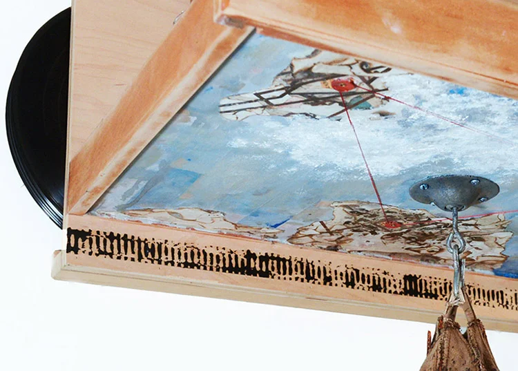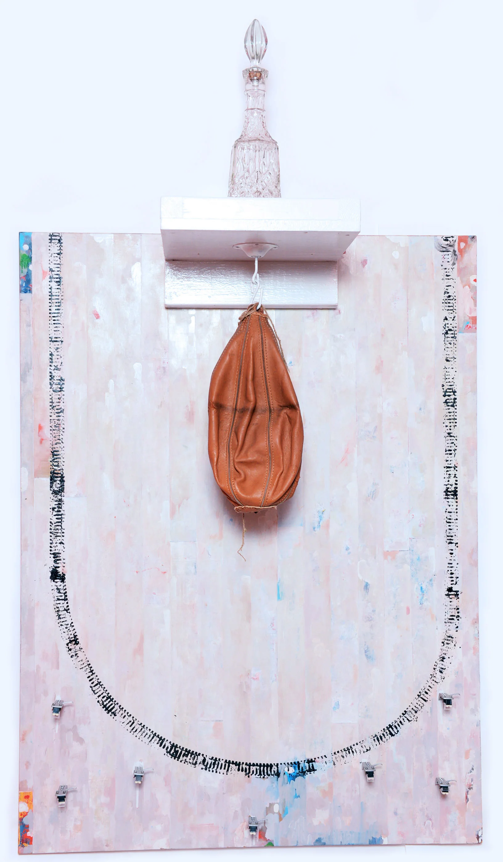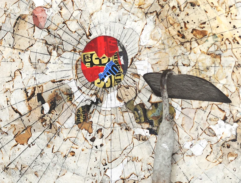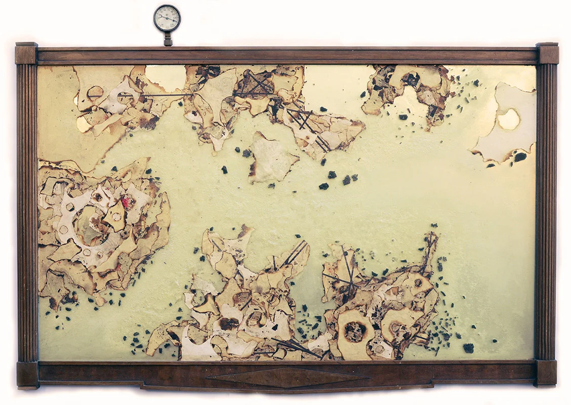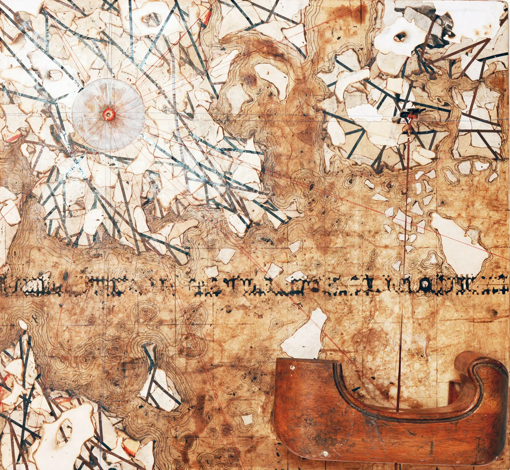 cassette tape, coffee, collage, conté, found objects, graphite, ink and wax on paper, mounted on wood