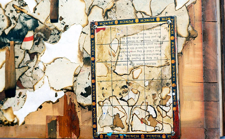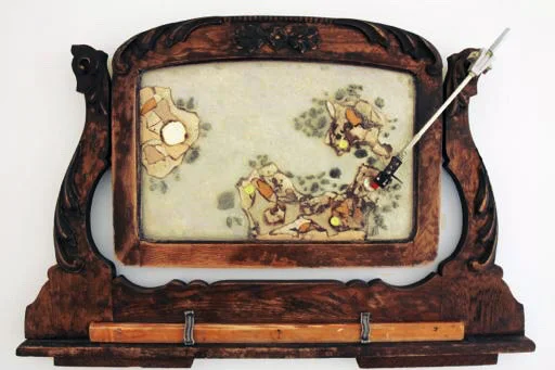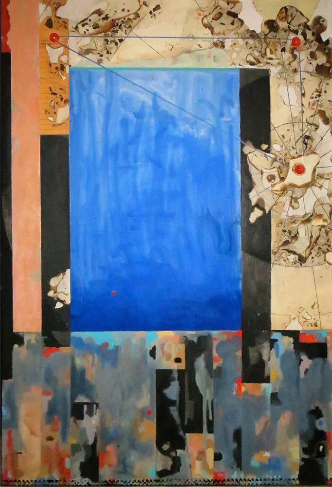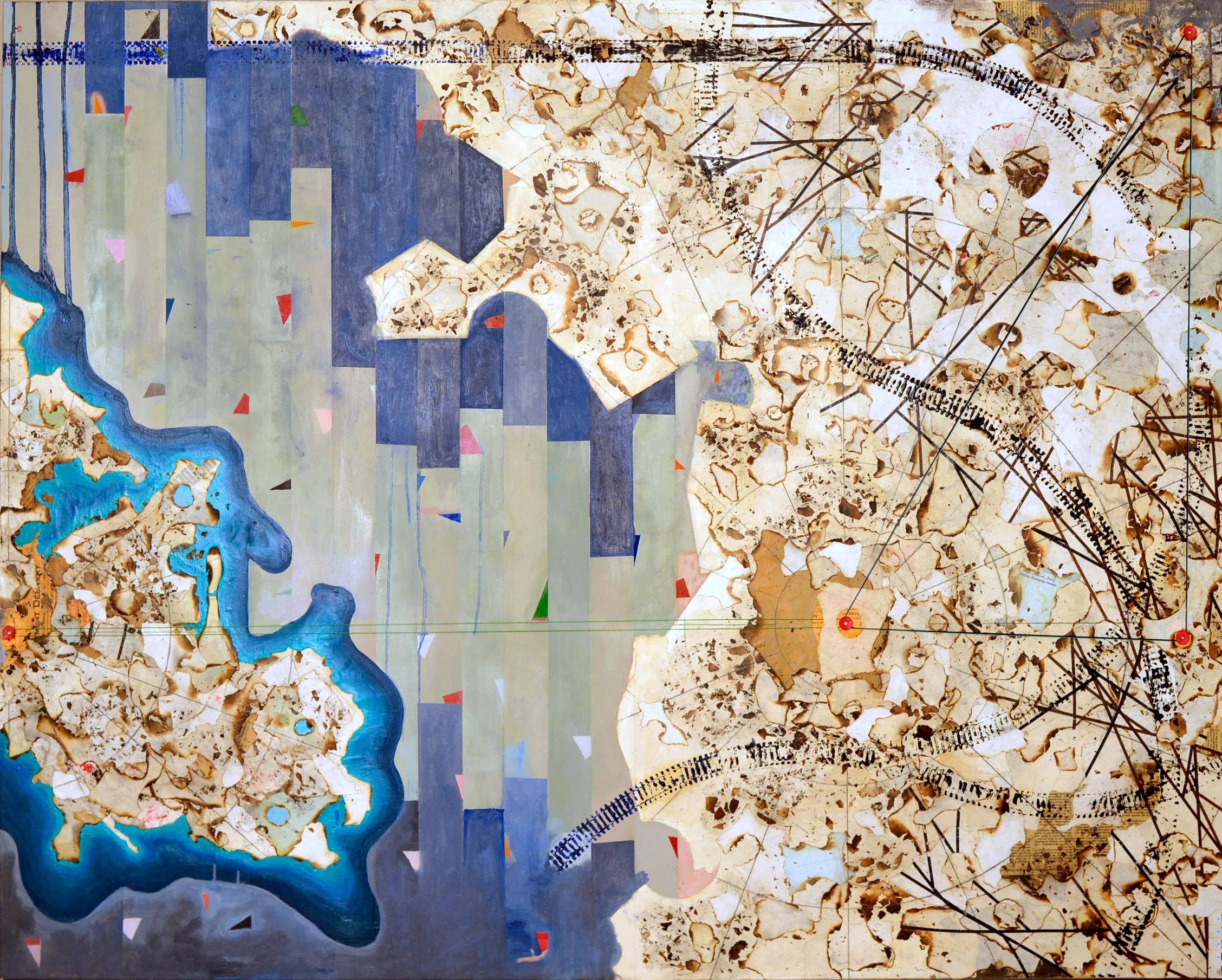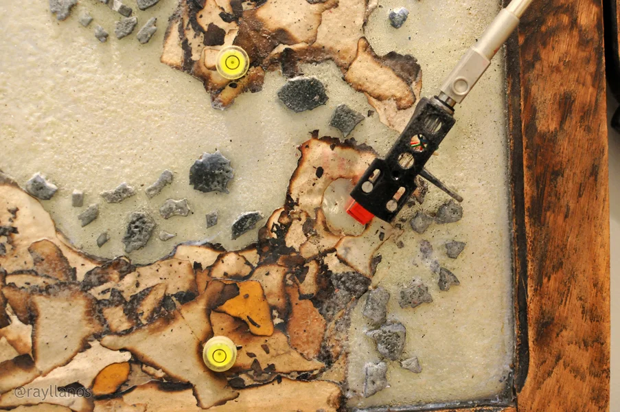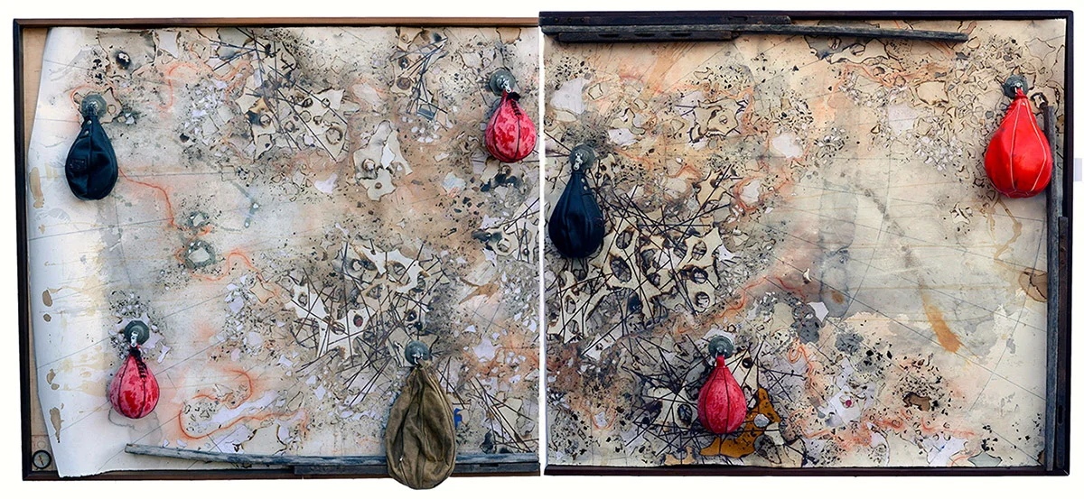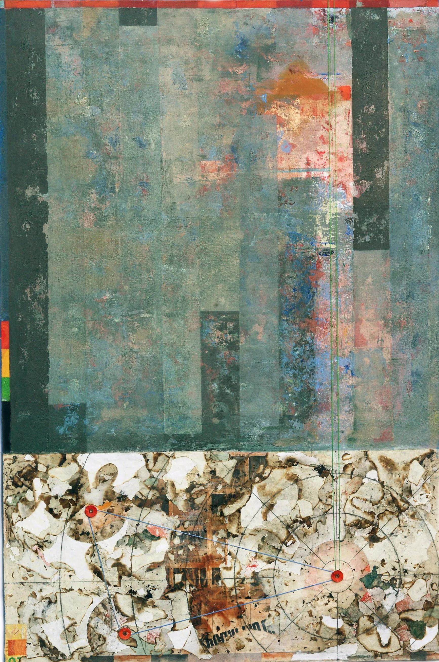 cassette tape, coffee, collage, conté, found objects, graphite, ink and wax on paper, mounted on wood