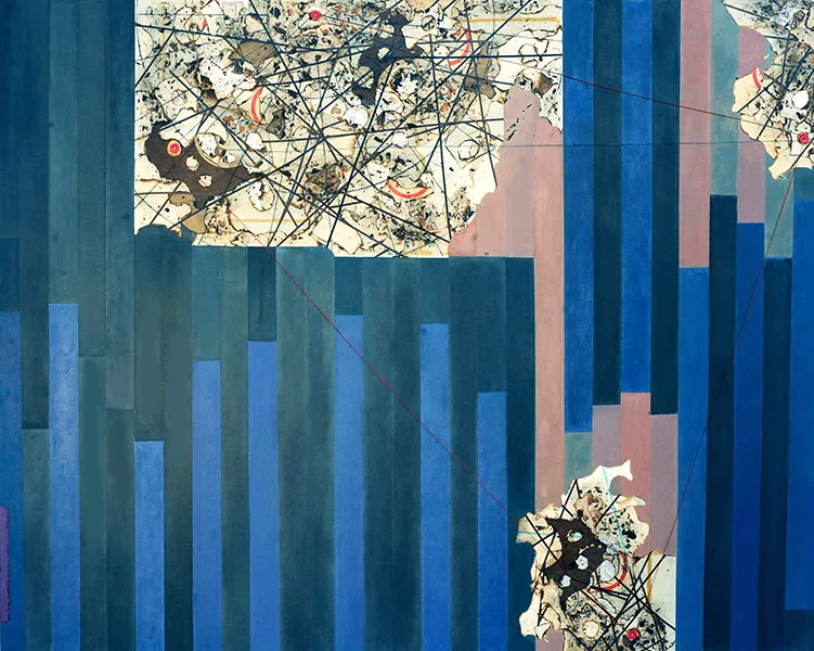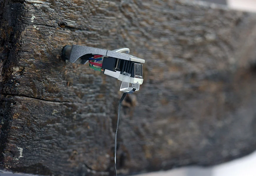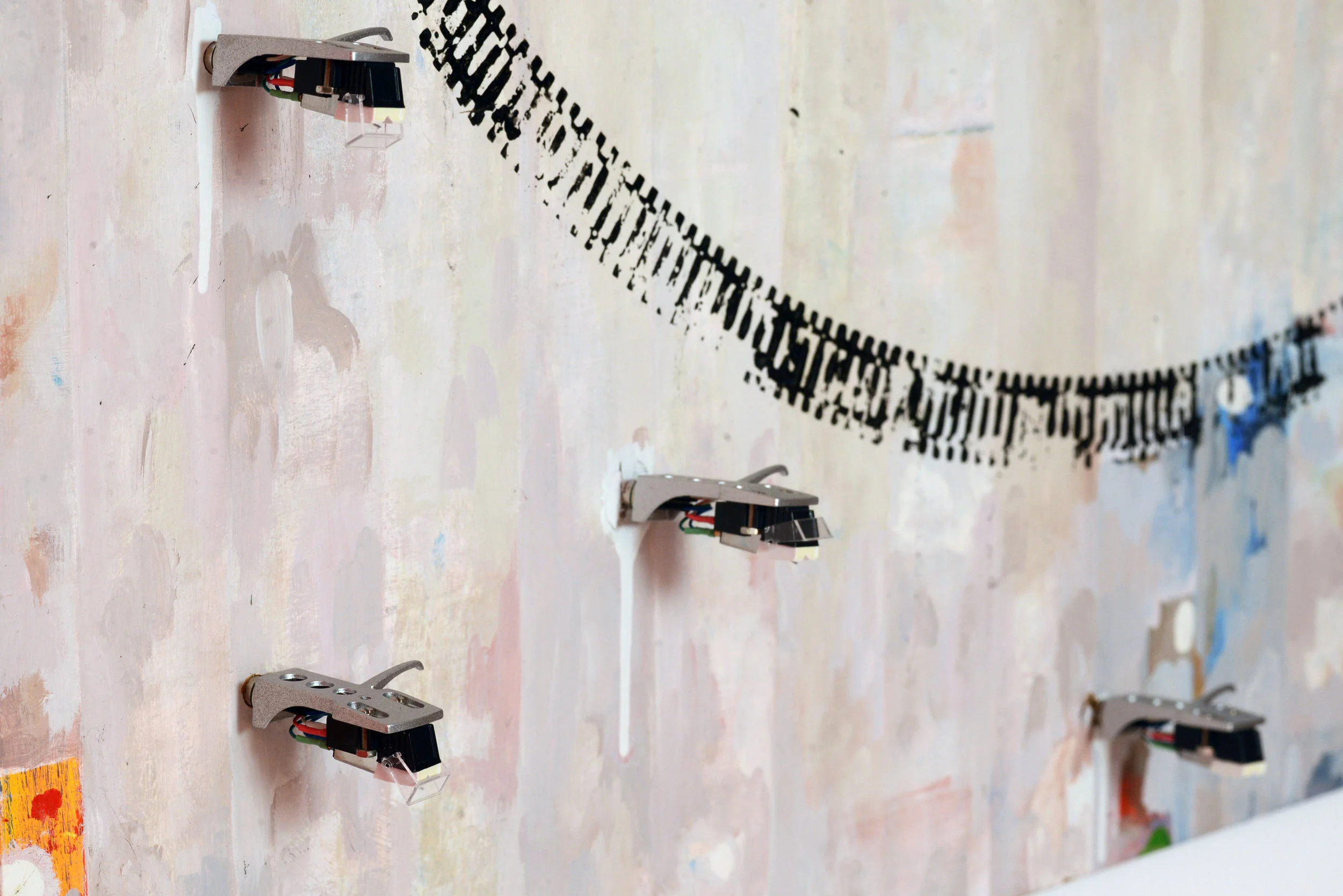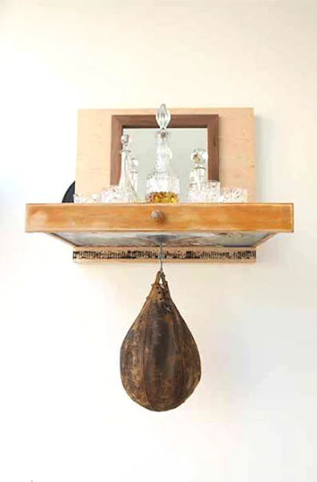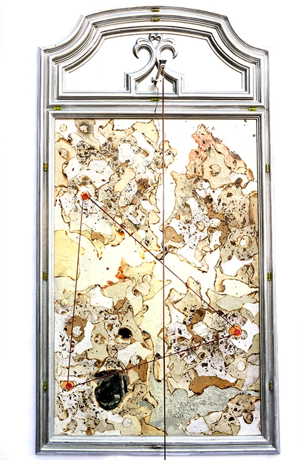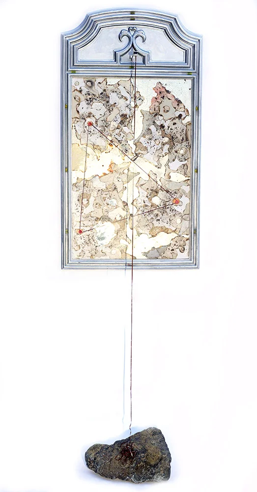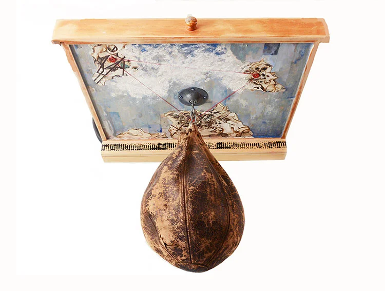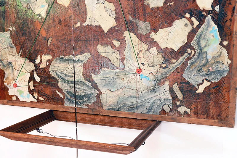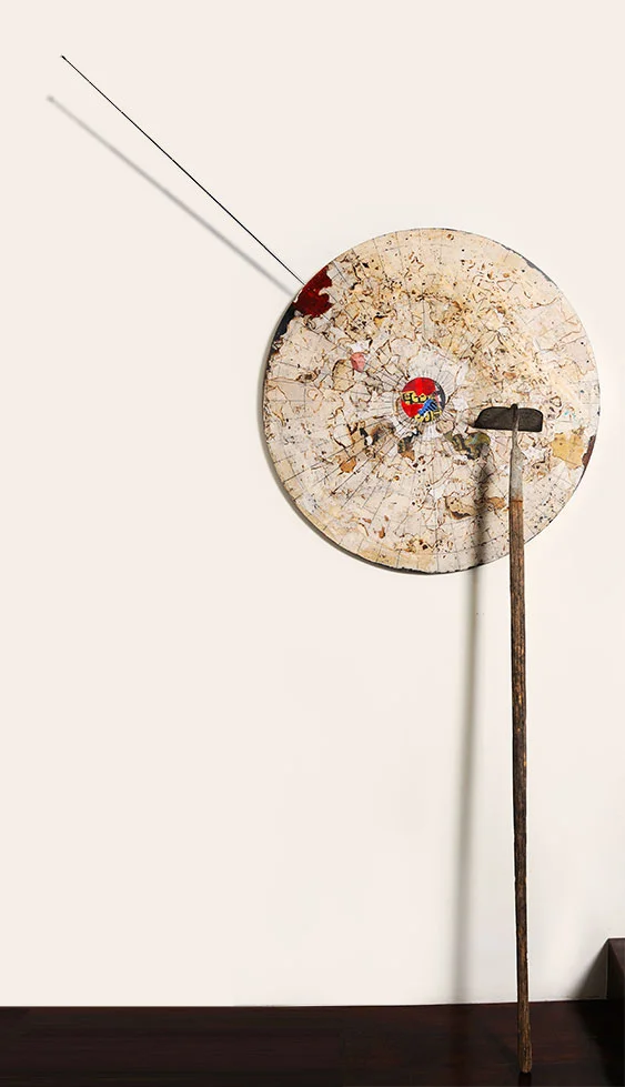 cassette tape, coffee, collage, conté, found objects, graphite, ink and wax on paper, mounted on wood